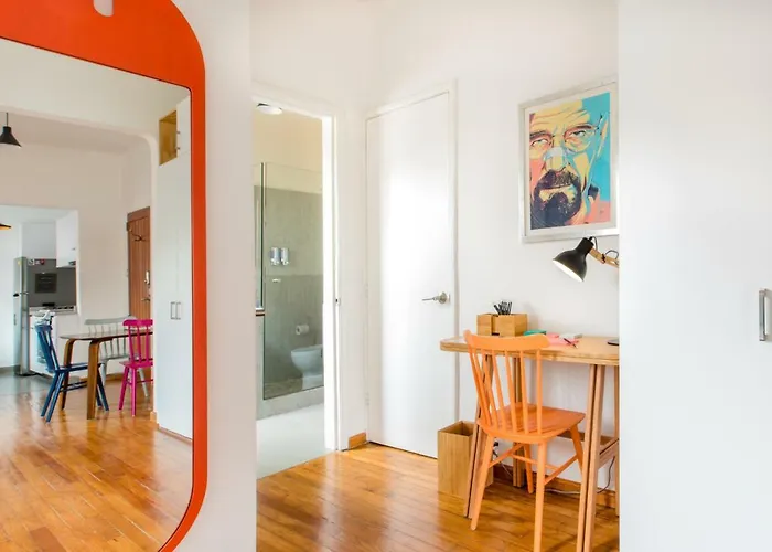 Die Ferienwohnung Juub Hip,Colorful Studio With Patio In Roma Norte Mexiko-Stadt befindet sich im Bezirk Condesa von Mexiko-Stadt, einen 5-minütigen Spaziergang vom Turibus Cibeles Brunnen entfernt.
